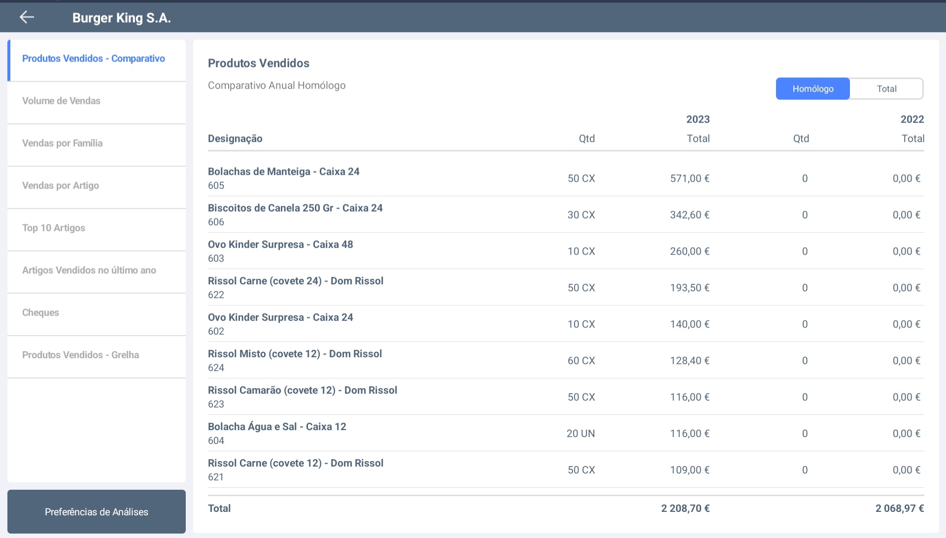 * <mark style="color:blue;">**Produtos Vendidos - Grelha ->**</mark> Grelha dos artigos vendidos por mês no respetivo ano. O ano pode ser modificado para o ano anterior e os resultados da análise podem ser alterados entre quantidade e valor (€).