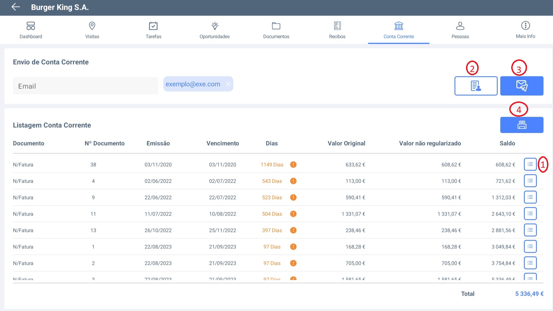 Na página da Conta Corrente terá uma lista das faturas com informação do n° do documento, data de emissão, data de vencimento, dias desde a data de vencimento, valor original do documento, valor não regularizado do documento e o saldo acumulado. Terá a possibilidade de visualizar as linhas de cada documento <mark style="color:red;">(1)</mark>, enviar a conta corrente por e-mail <mark style="color:red;">(2)</mark>, adicionar e-mails associados ao cliente <mark style="color:red;">(3)</mark> e imprimir a conta corrente <mark style="color:red;">(4)</mark>.