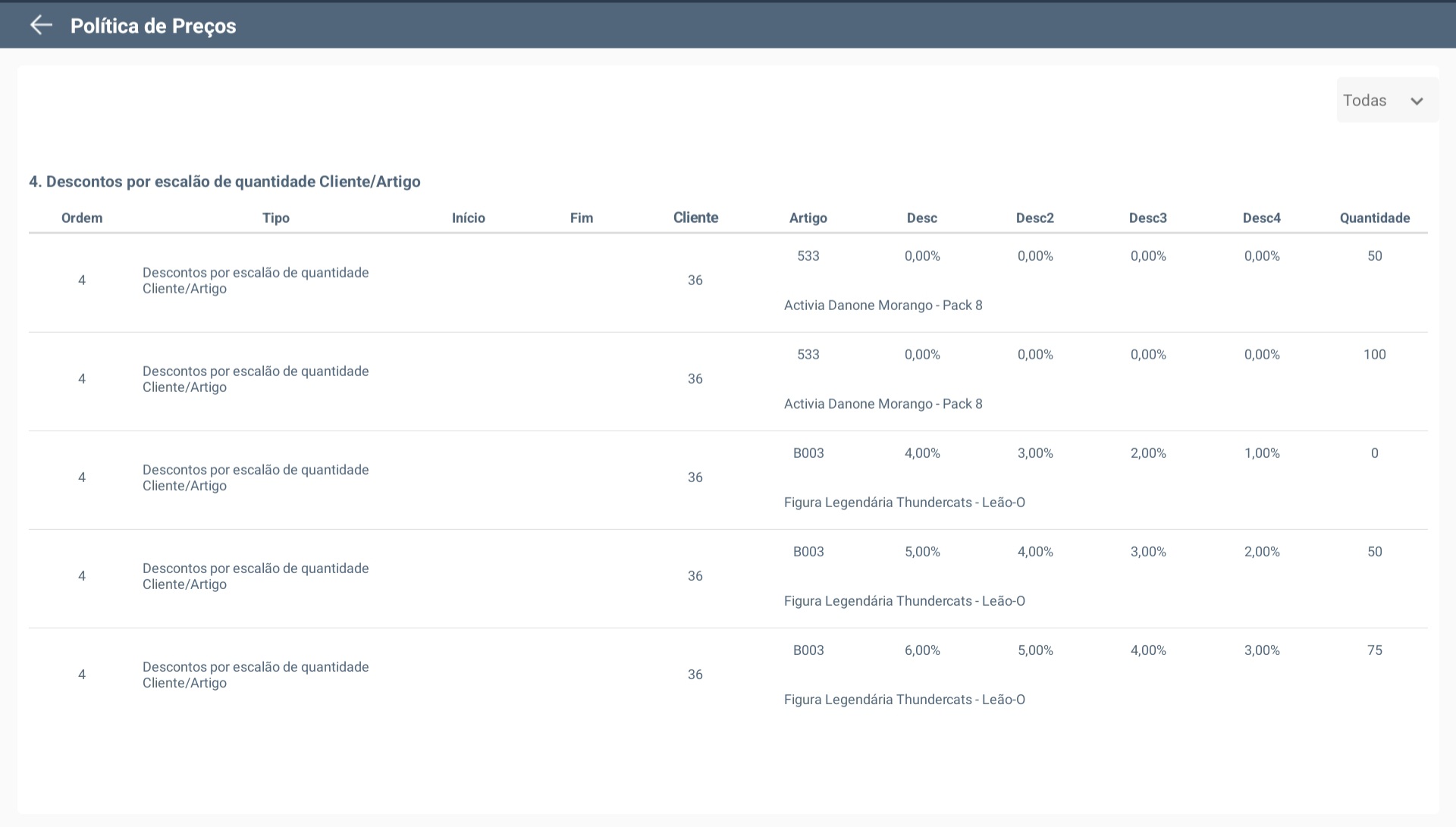 Na página de Politica de Preços encontra uma lista com as diferentes politicas aplicadas ao cliente.