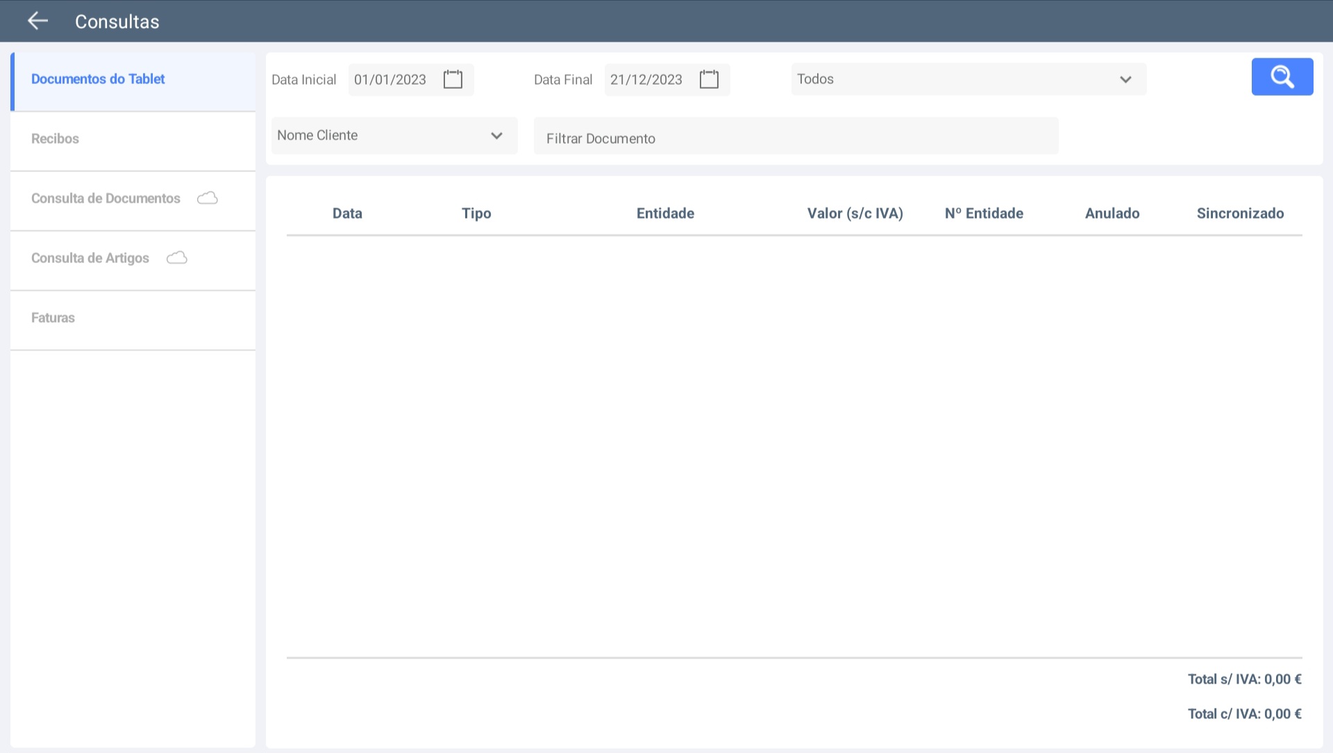 * *<mark style="color:blue;">**Documentos Do Tablet**</mark>*<mark style="color:blue;">**&#x20;**</mark><mark style="color:blue;">**->**</mark> Consulta dos documentos apenas criados no dispositivo. Terá ainda a possibilidade de ver as linhas do documento, enviar o documento por e-mail e imprimir o documento quando selecionado.